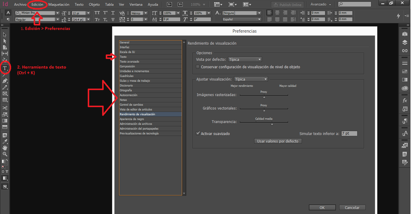 autocorrección.También podrás configurar algunos atajos de teclado bastantes útiles para ganar tiempo corrigiendo. - Hecho esto, vamos a la pestaña de Herramienta de texto. Puedes activarla en la columna de la izquierda, pinchando sobre el botón en el que aparece la letra té (T), o mediante el atajo Ctrl + K. Recuerda que este paso es necesario si queremos meternos en faena: no podrás meterle mano al texto sin haber marcado la T.