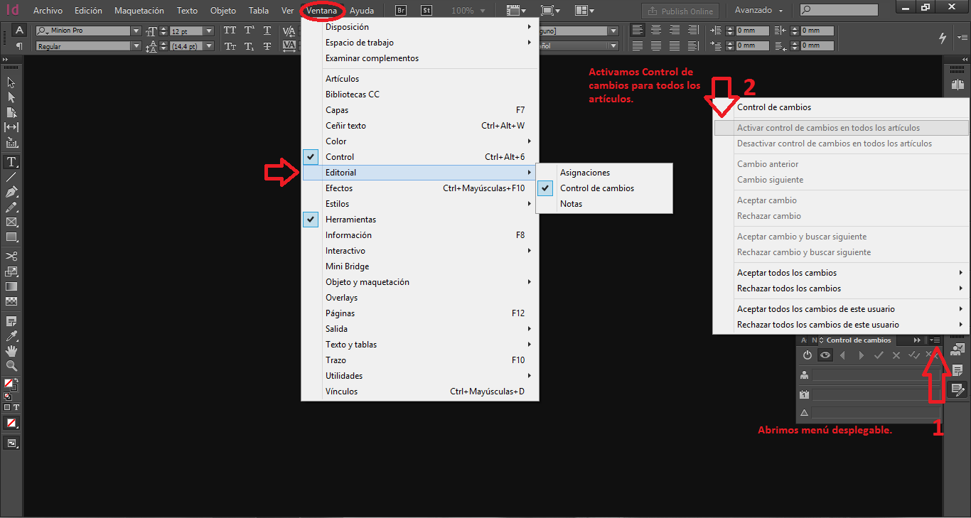 6. Si la corrección ha de ir con control de cambios activado (suele ser así el 99,99 %), ve a la barra de herramientas superior y pincha en Ventana. Allí busca Editorial y clica encima; aparecerá un menú desplegable con tres opciones: la nuestra es Control de cambios, el cual podrás activar solo para el artículo que estás corrigiendo (esto es, una de las partes de las que se compone el archivo .indd) o para el documento entero (todos los artículos). Una vez activado, todo lo que toquetees quedará registrado (más o menos, como en Word). Este menú suele aparecer y quedarse anidado en la barra de herramientas derecha, aunque podemos colocarlo donde nos sea más útil).